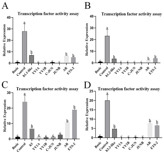 Four promoters of 1928 bp, 1675 bp, 1940 bp, and 1974 bp were cloned in the upstream region of h1.1-like, h1.2-like, h3, and h3.3-like 5′UTR, which were subsequently transfected into HEK 293T cells and detected by dual luciferase activity. The h1.1-like, h1.2-like, h3, and h3.3-like promoters presented transcriptional activity. The promoter activity of the h1.1-like, h1.2-like, h3, and h3.3-like promoter regions decreased after binding to the four transcription factors YY1A, YY1B, C-JUN, and JUNB, whereas the promoter activity of the h3 and h3.3-like promoter regions increased after binding to the AR and ETS-2 transcription factors (Figure 4).