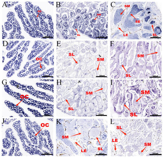 (A–L) Antisense probe (A–C) h1.1-like ISH results. (D–F) h1.2-like ISH results. (G–I) h3 ISH results. (J–L) h3.3-like ISH results. (A,D,G,J) The antisense probe binds to the female. (B,E,H,K) The antisense probe binds to the male. (C,F,I,L) The antisense probe binds to the pseudomale. The fish fillets of each sample were 1 year old. SM: sperm, SL: lobule, LE: Leydig cells, SE: Sertoli cells, and OC: oocyte.