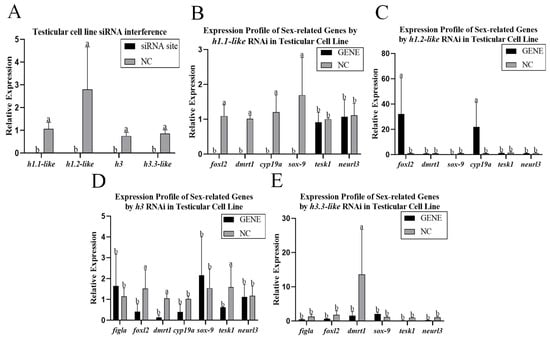 (A) Relative expression levels of h1.1-like, h1.2-like, h3, and h3.3-like in the testicular cell line. (B) Expression profile of sex-related genes affected by h1.1-like RNAi in the testicular cell line. (C) Expression profile of sex-related genes affected by h1.2-like RNAi in the testicular cell line. (D) Expression profiles of sex-related genes affected by h3 RNAi in the testicular cell line. (E) Expression profile of sex-related genes affected by h3.3-like RNAi in the testicular cell line. A p-value less than 0.05 was considered to indicate a significant difference between the two groups. In multiple comparisons, different alphabets indicated significant difference.