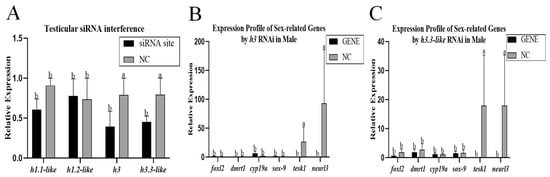(A) Relative expression levels of h1.1-like, h1.2-like, h3, and h3.3-like in the testicular cell line. (B) Expression profile of sex-related genes affected by h3 RNAi in the testicular cell line. (C) Expression profile of sex-related genes affected by h3.3-like RNAi in the testicular cell line. A p-value less than 0.05 was considered to indicate a significant difference between the two groups. In multiple comparisons, different alphabets indicated significant difference.