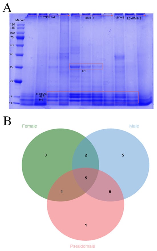 (A) Histone extraction experimental results. M: male; PM: pseudomale. (B) Venn diagram of histones of screened females, males, and pseudomales.