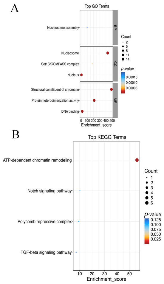 The BCA protein concentration determination kit (Solarbio, China) was used to determine the concentration of the histone mixture. The samples were run on a 12% SDS–polyacrylamide gel electrophoresis (SDS-PAGE) gel at 140 V voltage for 60 min and stained with Coomassie Blue dye. The results revealed that H1 is likely 35 kDa, H3/H2B, H2A, and H4 is likely 11–25 kDa (Figure 8A). Histone data were screened from the mass spectrometry results for comparative analysis and research (Figure 8B). Overall, the degree of histone modification in male fish is greater than that in female fish and pseudomale fish. There are more histones identified and more sites and forms of modification (Table 3). GO analysis revealed that the histones of Chinese tongue sole were involved in biological processes, cellular components, and molecular functions, with the largest proportion being structural components of nucleosomes and chromatin (Figure 9A). KEGG analysis revealed that histones were most enriched in the ATP-dependent chromosome remodeling pathway, indicating that histone genes may have a role in the chromosome remodeling pathway (Figure 9B). According to the connectivity in the PPI network, the first two histones that were enriched were H4 and H2A. Histone H2A variants have a unique role in the process of sperm chromatin packaging. Histone H4 is one of the slowest-evolving histones (Figure 10).
