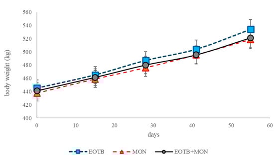 Body weight evolution during the last 60 days of fattening of steers fed a total mixed ration and supplemented with a blend of essential oils, tannins and bioflavonoids (EOTB), monensin (MON), or their combination (EOTB + MON). The bars represent the standard error of the mean.