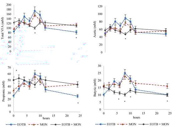 Daily kinetics od ruminal volatile fatty acids (VFAs) in steers fed a total mixed ration and supplemented with a blend of essential oils, tannins and bioflavonoids (EOTB), monensin (MON), or their combination (EOTB + MON). Each point corresponds to the average of 4 steers across 3 periods, * denotes at least one difference between treatments at p < 0.05, and the bars represent the standard error of the mean.