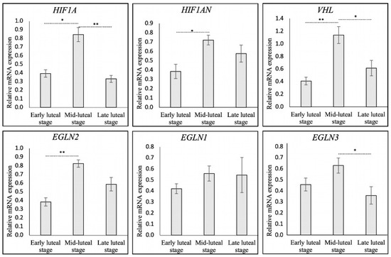 Relative mRNA expression of HIF1A (HIF1α) and HIF1α-regulating factors, i.e., EGLN2 (PHD1), EGLN1 (PHD2), EGLN3 (PHD3), HIF1AN (FIH), and VHL in bovine CL during early, mid-, and late luteal stages. Relative gene expression as determined by semi-quantitative real-time (TaqMan) PCR is presented as mean ± standard error of mean (±SEM). Bars with asterisks differ at * p < 0.05 and ** p < 0.01.