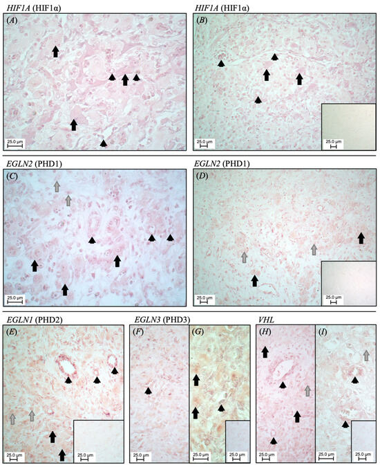 Luteal localization of transcripts (mRNA) encoding for HIF1A (HIF1α) (A,B), EGLN2 (PHD1) (C,D), EGLN1 (PHD2) (E), EGLN3 (PHD3) (F,G), and VHL (H,I) in bovine CL, shown at mid-luteal stage. Black arrow: large luteal cells; grey arrow: small luteal cells; arrowhead: vessel. Explanations in text. The sense probes were employed as negative controls (smaller inserts at the same magnification to (B,D,E,G,I)).