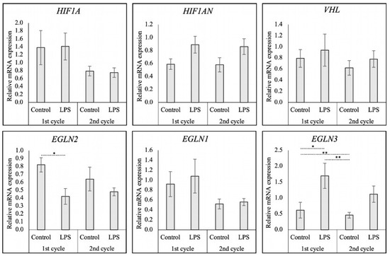 LPS treatment had significant effects upon the expression of EGLN2 (PHD1) (p < 0.05) and EGLN3 (PHD3) (p < 0.001) compared to the controls (determined by Kruskal–Wallis test). Other factors, including HIF1A (p > 0.05), EGLN1 (PHD2) (p > 0.05), HIF1AN (FIH) (p > 0.05), and VHL (p > 0.05), were unaffected by the treatment. As significant variations were observed in EGLN2 and EGLN3, post-tests were conducted for these two factors, revealing that the administration of LPS (Figure 3) decreased the transcript levels of EGLN2 compared with the control group in the first cycle (p < 0.05). No carryover effects were observed in subsequent cycles in either the LPS-treated or control groups. Conversely, the mRNA expression of EGLN3 increased during LPS treatment compared to the control cycle (p < 0.05). A lower expression of EGLN3 was observed in the second cycle control samples compared to the control from the first cycle (p < 0.01), possibly due to a cycle-dependent variation.