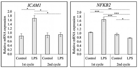 LPS treatment affected the luteal expression of ICAM1 (p < 0.01) and NFΚB2 (p < 0.001) (one-way ANOVA) (Figure 4). In the first cycle, both ICAM1 (p < 0.05) and NFKB2 (p < 0.001) mRNA levels were significantly higher in the LPS-treated samples than in the non-treated controls. In the second cycle, no difference in ICAM1 mRNA levels was observed between the two groups (p > 0.05), while the expression of NFKB2 was lower in the biopsies deriving from previously LPS-treated animals compared with controls (p < 0.05). Additionally, the expression of both ICAM1 (p < 0.05) and NFKB2 (p < 0.001) in LPS-treated animals was lower in the subsequent cycle when compared to the first cycle, while the expression in control animals remained constant. Interestingly, the expression of NFKB2 in biopsies collected in the subsequent cycle of LPS-treated animals was lower than the expression in control biopsies in the first (p < 0.01) and second cycle (p < 0.05).