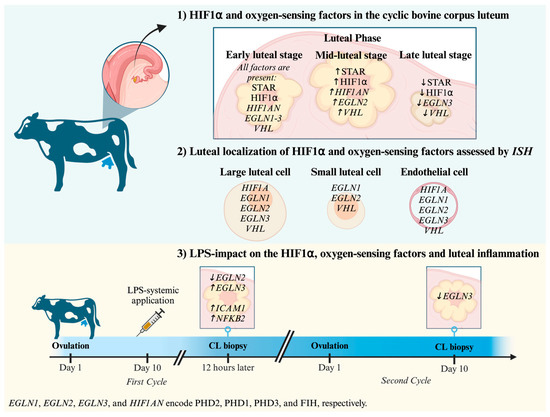 Our study provides new insights into the possible regulation of HIF1α in the bovine CL (summarized in the Figure 5), thereby introducing a new aspect to its functional implications in reproduction. While the mid-luteal stage appears to be a critical period characterized by increased HIF1α activity, our results suggest the involvement of PHDs, VHL, and FIH in regulating HIF1α levels throughout the CL lifespan. Furthermore, the changes observed in PHD expression in response to LPS treatment highlight the intricate interplay between lower oxygen tension and immune responses within the CL microenvironment, which may affect luteal function and progesterone production.