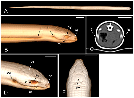 The 3D volume rendering (A,E in the dorsal view, B,D in the lateral view) and transverse 2D (C) CT images of a specimen of Pseudopus apodus. The lateral groove, mouth, nostrils, eyes, eyelids, otic clefts, and parietal eye are identified. See the list for abbreviations. Bar = 10 mm.