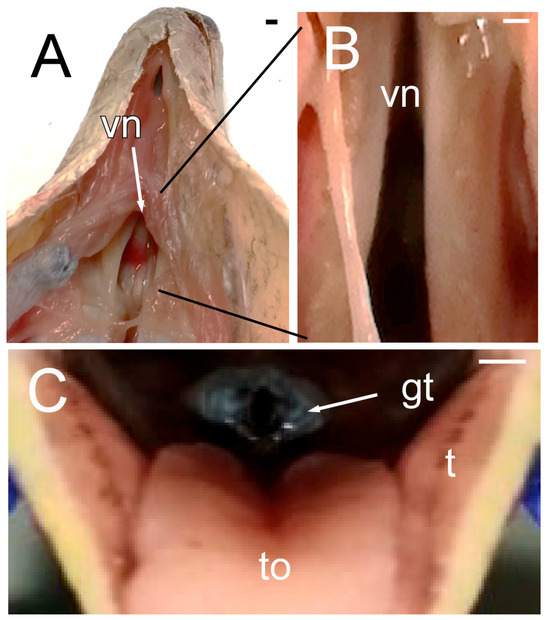 In the oral cavity, a wide overture that coincides with the vomeronasal organ and the choanae opening stands out (Figure 3A,B). The presence of the glottis, quite cranial in the oral cavity, and visible when the mouth is opened (Figure 3C), is noteworthy. The upper airways also include a larynx and pharynx that do not show special details. To complete the macroscopic description of the oral cavity, the cone-shaped, slightly asymmetrical teeth and the forked tongue should also be highlighted (Figure 3C).