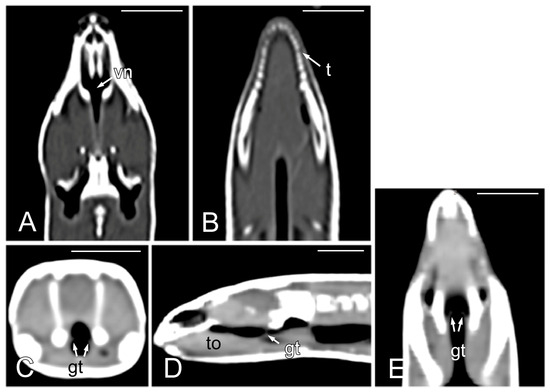 The opening of the vomeronasal organ together with the choanae was identified in the dorsal plane as a V-shaped structure delimited by thin hyperattenuating margins (Figure 4A). The teeth were more distinctly evaluated in the dorsal plane (Figure 4B). The tongue appeared as a hypoattenuating structure located in the ventral part of oral cavity and was more clearly visible in the sagittal plane (Figure 4D). The glottis (Figure 4C–E) was identified as a thin, soft tissue structure with a central opening between the oral and pharyngeal cavities. Although it was visible in the transverse, sagittal, and dorsal planes, it was easier to identify in the latter two.