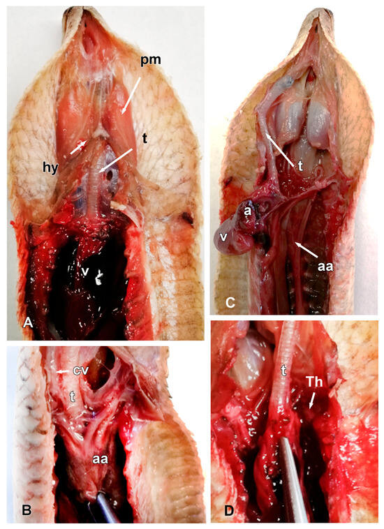 The images of the dissection of Pseudopus apodus in the ventral plane showing the hyoid bone (A), the trachea (A–D), the cranial cava vein, and aortic arches (B), the atria and ventricle (A,B), and the thyroid gland (D). See the list for abbreviations. Bar = 10 mm.