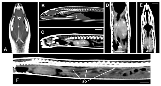 The CT images of Pseudopus apodus in the dorsal (A,D,E) and sagittal (B,C,F) planes showing the hyoid bone (A), the trachea (B), the atria and ventricle (C,D), the sinus venosus and the two cranial cava veins (D), the aortic arches (E), and the dorsal aorta. The images (C–F) were obtained after contrast media administration. See the list for abbreviations. Bar = 10 mm.