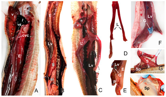 Venous blood from the posterior part of the coelomic cavity returns to the heart via a caudal cava vein, which together with the cranial cava veins, flows into the venous sinus (widening of the right atrium) (Figure 7A). The trachea extends from the larynx to the entrance of the thoracic cavity. It divides into two primary bronchi (left and right) that enter the lungs. The sac-like lungs are paired and elongated (Figure 7C) and are situated dorsocaudally to the heart and dorsally to the cranial parts of the liver and stomach. When comparing the left and right sides, there is a clear asymmetry with respect to their lengths: the left lung was shorter and reduced compared to the right (Figure 7D). The liver is an elongated structure, topographically related to the esophagus, stomach, and lungs (Figure 7A–C). Towards the middle of its course, it is possible to observe the gallbladder (Figure 7F). With an elongated morphology, the esophagus flows into the stomach (Figure 7G), which continues with the small intestine (Figure 7B). The spleen is, in relation to the stomach, the small intestine (between the intestinal serosa) (Figure 7G,H), and the pancreas, very visible at the beginning of the small intestine (Figure 7G).