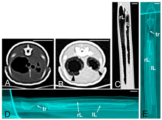 The CT images of Pseudopus apodus in the transverse (A,B) and dorsal (C) planes, and the 3D volume rendering showing the airways (D,E). Image (A) was obtained with a soft tissue algorithm and shows the main bronchi bifurcation (white arrow), while images (B,C) were postprocessed using a lung algorithm and show the peripheric hypoattenuating area (black arrowheads) around an air-filled cavity. The images (D,E) were postprocessed using the 3D volume rendering with airways algorithm and offer a detailed representation of the trachea (tr) and lungs (L). Bar = 10 mm.