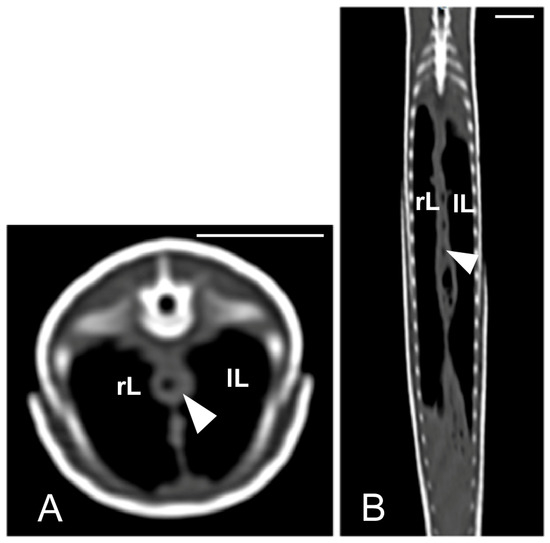 The CT images of Pseudopus apodus in the transverse (A) and dorsal (B) planes showing segments of the esophagus (arrowheads) with intraluminal gas. The esophagus is located between the lungs (L). Bar = 10 mm.