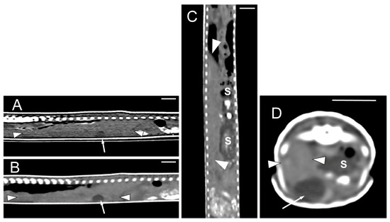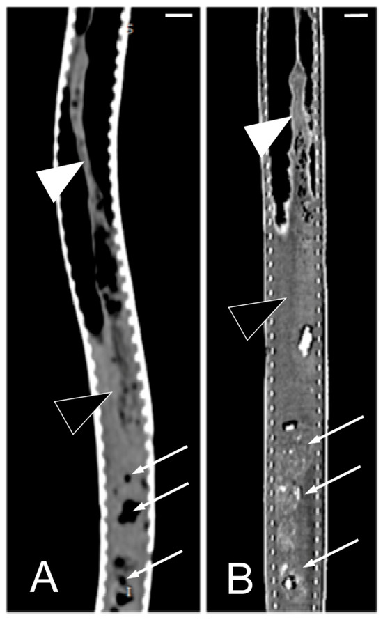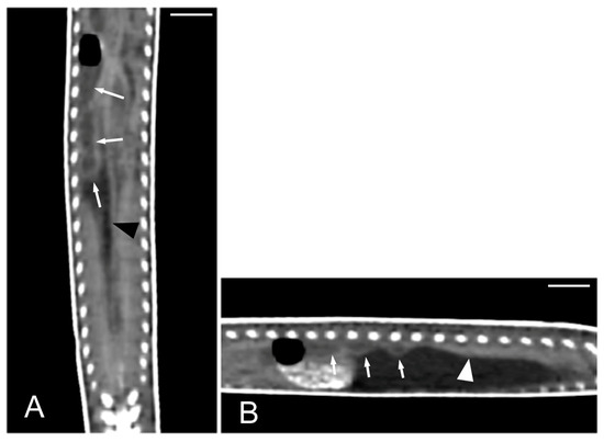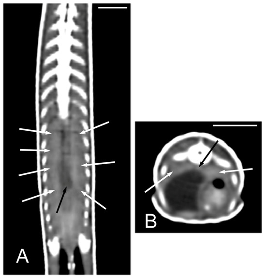 The CT images of Pseudopus apodus in the dorsal plane showing segments of the esophagus (white arrowheads), stomach (black arrowheads), and intestine (white arrows) with intraluminal gas (A) and with gas and hyperattenuating content (B). Bar = 10 mm.