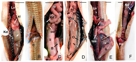 The images of the dissection of Pseudopus apodus showing the kidney, the cloaca, the bladder (A–C), and the ovarian system (C,D), including the oocites, an ovary duct, and an ovary (B–E). In the case of a male, it is also possible to see the testicles and the hemipenes (E,F). See the list for abbreviations. Bar = 10 mm.