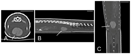 The CT images of Pseudopus apodus in the transverse (A), sagittal (B), and dorsal (C) planes showing hyperattenuating content (urate salts) (arrows) in the cloaca. Bar = 10 mm.