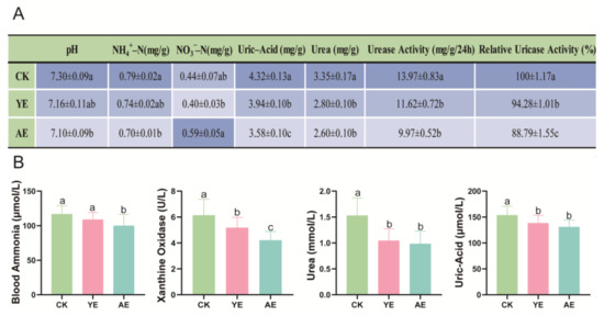 Uric acid is the primary form of nitrogen in the poultry gut [31]. The results of this study demonstrate that dietary supplementation with 0.1% YE or AE significantly reduced uric acid levels, urea, urease activity, and relative uricase activity (p < 0.05) (Figure 2A). Furthermore, the AE group exhibited a significant decrease in gut pH and NH4+-N content, as well as an increase in NO3--N content compared to the CK and YE groups.