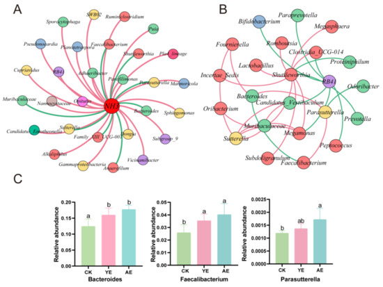 To investigate the relationship between NH3 emissions and gut bacterial genera, a network analysis was conducted using Pearson’s correlation analysis with the three groups. Among the bacterial genera, 22 showed positive correlations with NH3 emissions, while 8 showed negative correlations (Figure 4A, Supplemental Table S6). Notably, RB41 exhibited a positive correlation with NH3 emissions but a negative correlation with other bacterial genera (Figure 4B, Supplemental Table S7). Its relative abundance decreased in the YE group and AE group compared to the CK group. Conversely, Bacteroides, Parasutterella, and Faecalibacterium were negatively correlated with NH3 emissions and RB41 but positively correlated with Lactobacillus and Shuttleworthia. Their relative abundances significantly increased in the YE group and AE group compared to the CK group (p < 0.05) (Figure 4C).