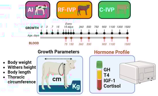 Developments in assisted reproductive technologies (ART) have significantly reshaped the livestock production landscape, offering novel approaches to enhance breeding efficiency and genetic progress. Among the major ART contributing to the accelerated genetic improvement of cattle populations are artificial insemination (AI) and in vitro embryo production, followed by embryo transfer (IVP-ET) [1]. Artificial insemination has been widely used in the cattle industry for decades. It is accepted that there are no major differences between AI-derived and naturally conceived animals. However, this may not be the case when compared to IVP-ET animals [2]. The number of IVP-ET transfers has been increasing yearly, with more than 1 million reported by the International Embryo Technology Society (IETS) in 2022 [3]. Information on the phenotypical traits of these animals in adulthood is limited. Recent studies suggest differences in health, milk production, fertility, and gestational length compared to AI or multiple ovulation-embryo transfer-derived animals [2,4]. However, information on other traits related to growth and its endocrine regulation from birth to adulthood is scarce. In the field of livestock management, it is essential to improve our understanding of the physiological mechanisms that control the growth and development of animals based on their origin. This will enable us to determine whether the performance of IVP-ET animals is comparable to that of their in vivo-derived counterparts, thereby contributing to the improvement of the industry and the welfare of the animals. Indeed, growth parameters and hormone concentrations play pivotal roles in shaping the overall productivity and well-being of cattle. Among the key hormones influencing growth and metabolism, growth hormone (GH), insulin-like growth factor-1 (IGF-1), thyroxine (T4), and cortisol stand out as central regulators [5]. The intricate interplay between these hormones is known to regulate various physiological processes, including cell proliferation, protein synthesis, and metabolic homeostasis [6,7]. Besides their role in the regulation of metabolism, the measurement of cortisol levels is broadly used as a biomarker of animal’s stress levels and, thus, their well-being [8].