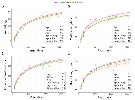 Evolution of the growth parameters included in the study considering age, group, sex, and their interactions. The lines represent the mean values of the growth parameters, and the haloes represent the 95% confidence interval. (A) Weight significantly increased with age (p < 2.0 × 10−16). (B) Withers height increased with age (p < 2.2 × 10−16) and was significantly greater in AI compared to the in vitro counterparts (p = 0.0008). (C) Thorax circumference increased with age (p < 2.0 × 10−16), and it was greater in AI compared to C-IVP (p = 0.044). (D) Body length increased with age (p < 2.2 × 10−16), and it was greater in AI and C-IVP compared to RF-IVP (p = 5.6 × 10−6). Only variables with significant differences were represented. Signification codes: NS, not significant; * < 0.05; *** < 0.001.