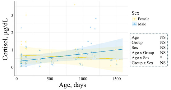Evolution of cortisol concentrations across age (75 to 1500 days of age) in both females and males. Lines represent the mean cortisol values and haloes the 95% confidence interval. Only in males, the concentration of cortisol significantly increased with age (p = 0.039). Only variables with significant differences were represented. Signification codes: NS, not significant; * < 0.05.