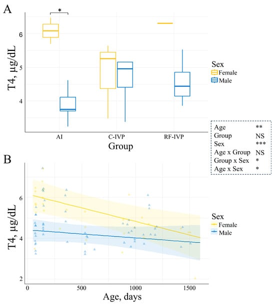 Depiction of the interaction of T4 concentrations with experimental group and age. (A) T4 concentration per group and sex at d75. Boxplots represent the median T4 values and the Q1/Q3. In the AI group, T4 concentration was greater in females compared to males (p = 0.03). (B) Evolution of T4 concentrations across age in females and males. The lines represent the mean T4 values, and the haloes represent the 95% confidence interval. Levels of T4 were reduced with age in both sexes, and this reduction was smaller in males than in females (p = 0.025). Only variables with significant differences were represented. Signification codes: NS, not significant; * < 0.05; ** < 0.01; *** < 0.001.