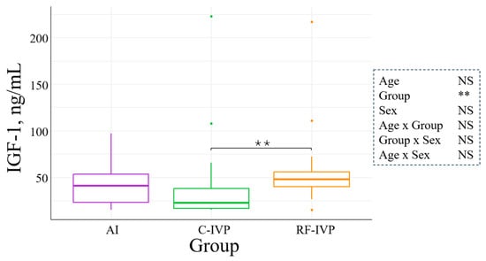 Concentration of IGF-1 at all ages in the different experimental groups. Boxplots represent the median and the Q1/Q3. The IGF concentration was greater in RF-IVP than C-IVP (p < 0.0075). Only variables with significant differences were represented. Signification codes: NS, not significant; ** < 0.01.