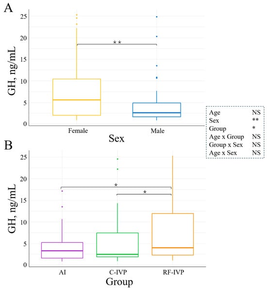 Differences in GH concentrations at all ages between (A) males and females and (B) experimental groups. Boxplots represent the median GH values and the Q1/Q3. (A) Females presented greater GH concentration than males (p = 0.004). (B) The GH concentration of the RF-IVP group was greater compared to the other two groups (p = 0.014). Only variables with significant differences were represented. Signification codes: NS, not significant; * < 0.05; ** < 0.01.