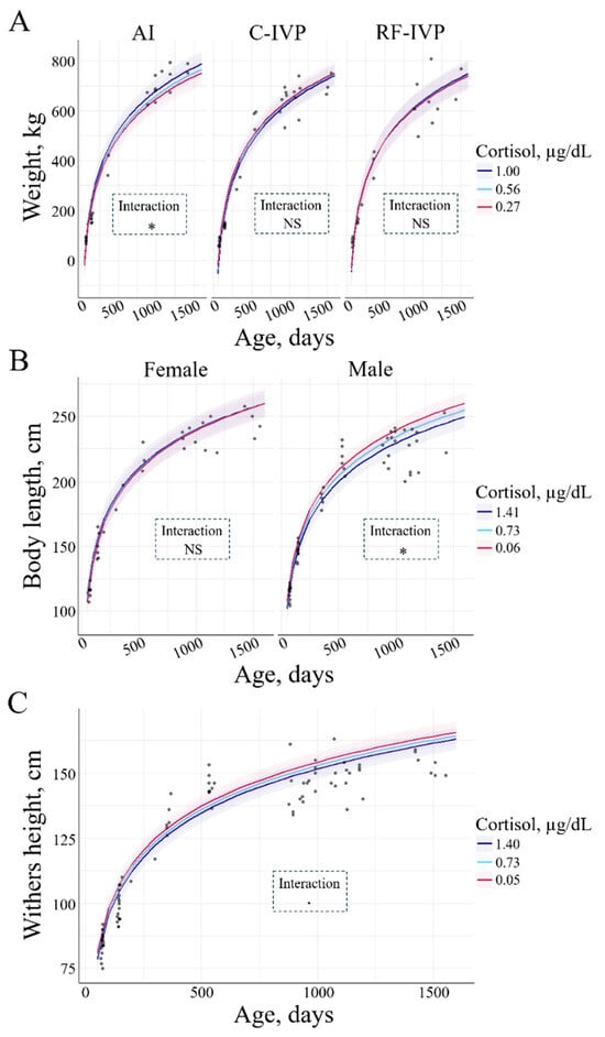 Interaction between cortisol and (A) weight, (B) body length, and (C) withers height across age. The lines represent the mean values of the growth parameters, and the haloes represent the 95% confidence interval. (A) There was an interaction between cortisol, weight, and group. In AI, greater cortisol corresponded to greater weight (p = 0.043). (B) An interaction between cortisol, body length, and sex was observed. In males, greater body length corresponded to lower cortisol (p = 0.013). (C) A tendency in the relationship between cortisol and withers height was observed. Lower height at withers corresponded to greater cortisol (p = 0.06). Only variables with significant differences or a tendency were represented. Signification codes: NS, not significant; • < 0.1; * < 0.05.