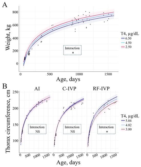 Interaction between T4 and the growth parameters studied across age. Only variables with significant differences were depicted. The lines represent the mean value of the growth parameters, and the haloes represent the 95% confidence interval. (A) An interaction between T4 and weight was observed. Greater T4 corresponded to greater weight (p = 0.025). (B) There was an interaction between T4, thorax circumference, and group. In RF-IVP, the greater the T4, the greater the thorax circumference (p = 0.016). Signification codes: NS, not significant; * < 0.05.