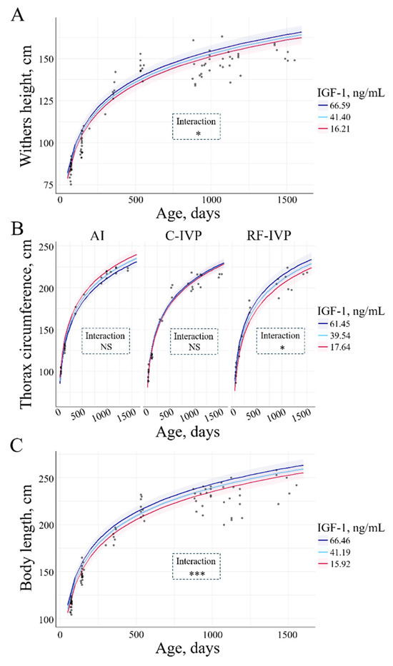 Interaction between IGF-1 and (A) withers height, (B) thorax circumference, and (C) body length across age. Only variables with significant differences were depicted. The lines represent the mean values of the growth parameters, and the haloes represent the 95% confidence interval. (A) An interaction between IGF-1 and height at withers was observed. Greater IGF-1 corresponded to greater withers height (p = 0.014). (B) There was an interaction between IGF-1, thorax circumference, and group. In RF-IVP, the greater the IGF-1, the greater the thorax circumference (p = 0.033). (C) An interaction between IGF-1 and body length was observed. The greater the IGF-1, the greater the body length (p = 0.0002). Signification codes: NS, not significant; * < 0.05; *** < 0.001.