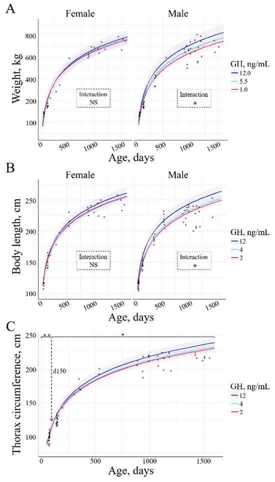 Interaction between GH and (A) weight, (B) body length, and (C) thorax circumference across age. Only variables with significant differences were depicted. The lines represent the mean values of the growth parameters, and the haloes represent the 95% confidence interval. (A) There was an interaction between GH, weight, and sex. Only in males, the greater the GH, the greater the weight (p = 0.048). (B) An interaction between GH, body length, and sex was observed. In males, the greater the GH, the greater the body length (p = 0.044). (C) An interaction between GH and thorax circumference was observed. There was a negative interaction between thorax circumference and GH until d150 (p = 0.0036) and a positive interaction from d150 until d1500 in all the experimental groups (p = 0.02). Signification codes: NS, not significant; * < 0.05; ** < 0.01.
