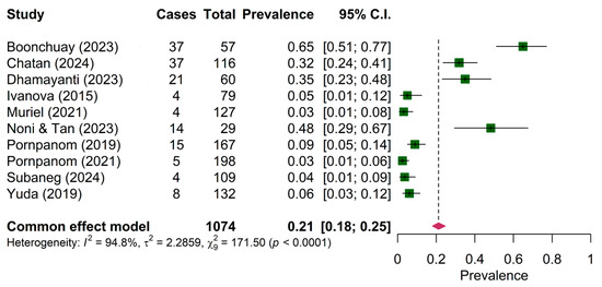 The present systematic review and meta-analysis have some limitations. Firstly, the heterogeneity among the included studies was high (I2 = 94.81%, 90.4% and 98.8% for the study on Plasmodium (Figure 2), Haemoproteus (Figure 3) and Leucocytozoon (Figure 4), respectively). Heterogeneity might occur due to the varied characteristics of samples or avian species. This was supported by the regression analysis that revealed the significant difference between the prevalence of Plasmodium in wild birds and domestic poultry. Second, the funnel plot and Egger’s test showed publication bias. Thus, this pooled prevalence might be influenced by some small-scale studies. Nevertheless, the prevalence of haemosporidian parasites in Southeast Asia was high, and there were a number of genetic diversities of undescribed species of haemosporidian parasites. In the future, combined microscopic and molecular studies are deemed necessary to explore the actual status of the parasite prevalence. PCR-based (molecular) techniques allow us to understand the genetic characteristics of parasites, which could be used for phylogenetic analysis and the description of lineages following the haemosporidian-specific public database, the MalAvi [9]. However, the microscopy technique was reported as an inexpensive method that can provide an opportunity to determine the identity and intensity of infection [60]. Additionally, the description of parasite morphospecies mainly relied on morphologic characteristics [1,4,5]. Thus, using combined methods might allow the identification of the species, genetic diversity, phylogeny and epidemiology of haemosporidian parasites.