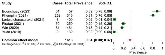 The prevalence of Haemoproteus sp. was reported in six papers on wild birds only. The pooled prevalence of Haemoproteus sp. was 18.00% (95% CI: 15.00–22.00%) (Figure 3). The prevalence of Haemoproteus sp. in the mainland region (19.89%, 95% CI: 16.23–24.14%) was significantly different from the maritime region (10.99, 95% CI: 6.56–15.43%) (Table 4). The pooled prevalence of Leucocytozoon sp. in both wild birds and domestic poultry was comparable among the six articles (34.00%, 95% CI: 30.00–37.00%) (Figure 4).