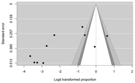 Funnel plot for prevalence of avian Plasmodium in Southeast Asia.