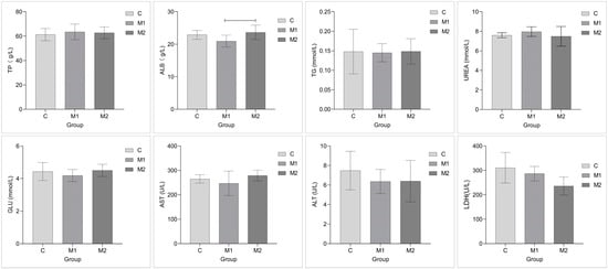 Figure 1 illustrates how the addition of Met altered the biochemical characteristics of the donkeys’ blood. The addition had an impact on the levels of ALB and LDH. The ALB level exhibited a clear decreasing trend in the M1 group compared to that of the M2 group (0.05 < p < 0.10); the ALB levels in the C group compared to that of the M1 group (p = 0.25) and in the C group compared to that of the M2 group (p = 0.78) were not significantly different. Compared with that in the C group, the concentration of LDH in the M2 group showed a significant decreasing trend (0.05 < p < 0.10); the concentration of LDH in C compared to that of the M1 group (p = 0.68) and in the M1 group compared to that of the M2 group (p = 0.22) were not significantly different. The other blood biochemical indicators, however, did not show significant changes (p > 0.10).