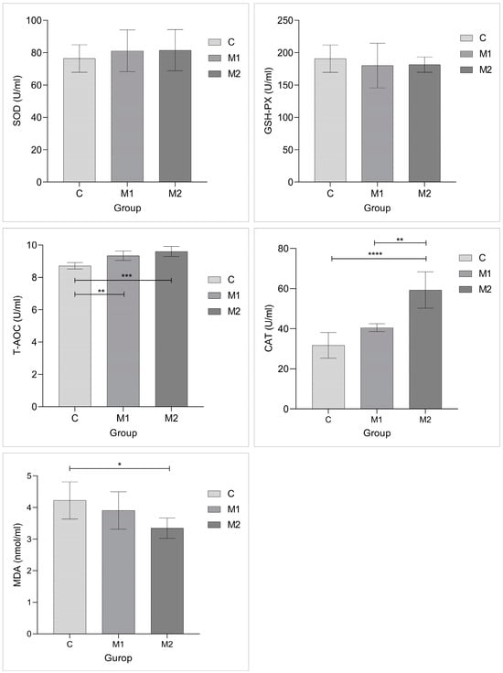 The changes in blood antioxidant indicators in lactating donkeys are displayed in Figure 2. The concentrations of T-AOC, CAT, and MDA changed significantly with Met supplementation (p < 0.05). The addition of Met considerably raised the serum T-AOC concentration in comparison to that of the C group (p < 0.01). The addition of Met significantly increased the activity of serum CAT (p < 0.01), with the highest activity observed in the M2 group (p < 0.01). The addition of Met (15 g/d) resulted in a significant decrease in the MDA concentration (p < 0.05). Furthermore, there was no difference in the SOD and GSH-PX levels across the three groups (p > 0.10).