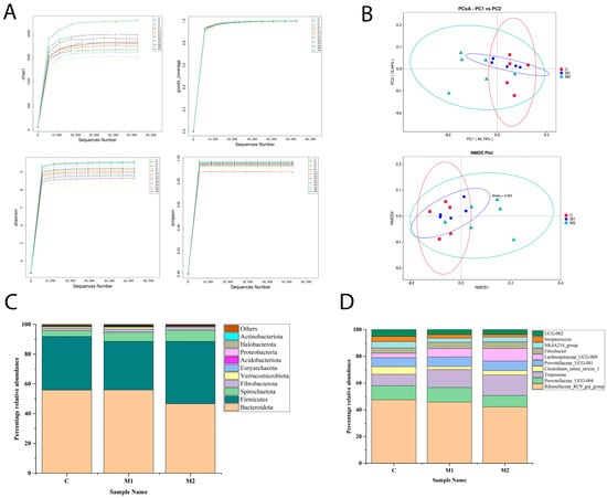 A satisfactory sequencing depth for the fecal microbiota content analysis was shown by the fact that over 98.0% of the valid data had a data quality score > Q20 after the invalid 16S rDNA sequences of all samples were filtered out. According to the alpha diversity dilution curves (Figure 3A), the data values for every sample were within the typical range. Among the frequently employed techniques for beta diversity analysis are PCoA and NMDS. The PCoA revealed no significant difference in species composition across the three groups in this experiment (Figure 3B) (p > 0.05), and the NMDS mapping analysis also confirmed the species composition similarity (p < 0.05).
