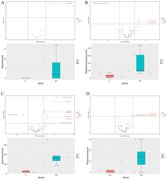 The effects of Met supplementation on the microbial variability in the feces of female donkeys. (A) The significant differences at the phylum level in the M1 group vs. the C group are shown in the volcano and box plots. (B) The significant differences at the genus level in the M1 group vs. the C group are shown in the volcano and box plots. (C) The significant differences at the genus level in the M2 group vs. the C group are shown in the volcano and box plots. (D) The significant differences at the genus level in the M2 group vs. the M1 group are shown in the volcano and box plots.