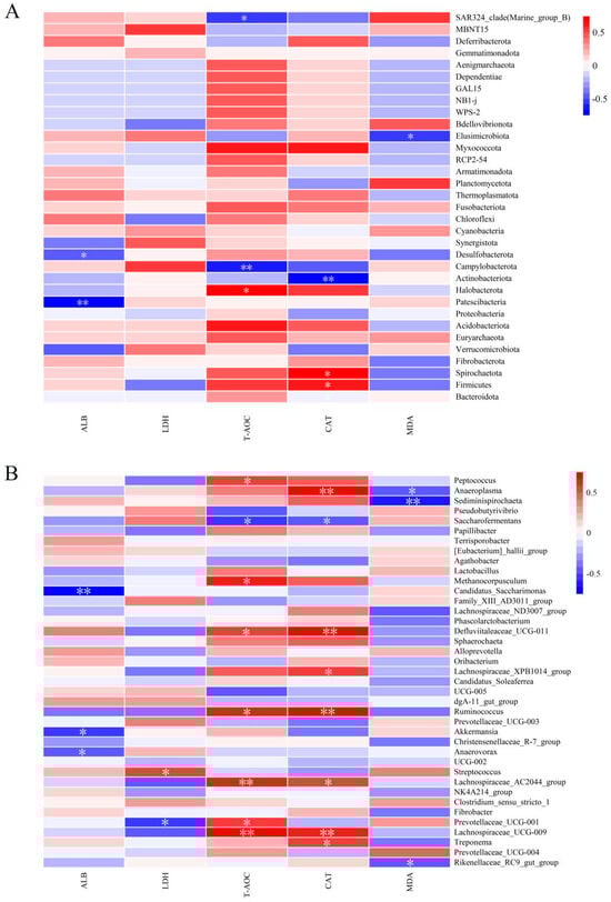 Spearman’s correlations between fecal microbiota and serum indicators. (A) Heatmap of phylum correlations. (B) Heatmap of genus correlations. Blue denotes a negative correlation, whereas red denotes a positive correlation. The Spearman correlation’s strength is indicated by the color intensity. ** p < 0.01 and * p < 0.05.