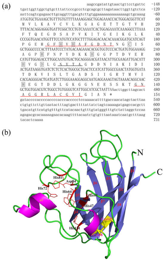 Nucleotide, the deduced aa sequences and 3D structures of BsCu/Zn-SOD. (a) Nucleotide and the deduced aa sequences of BsCu/Zn-SOD; nucleotides are numbered from the first base at 5′ end. Stop codons are marked with asterisks. Potential Cu2+-binding sites (His-47, -49, -64 h, and -121) and Zn2+-binding sites (His-64, -72, -81, and Asp-84) in BsCu/Zn-SOD were boxed. Putative family signature motifs are underlined in red. Po-tential N-glycosylation sites are underlined in black. (b) The predicted 3D structures of BsCu/Zn-SOD.