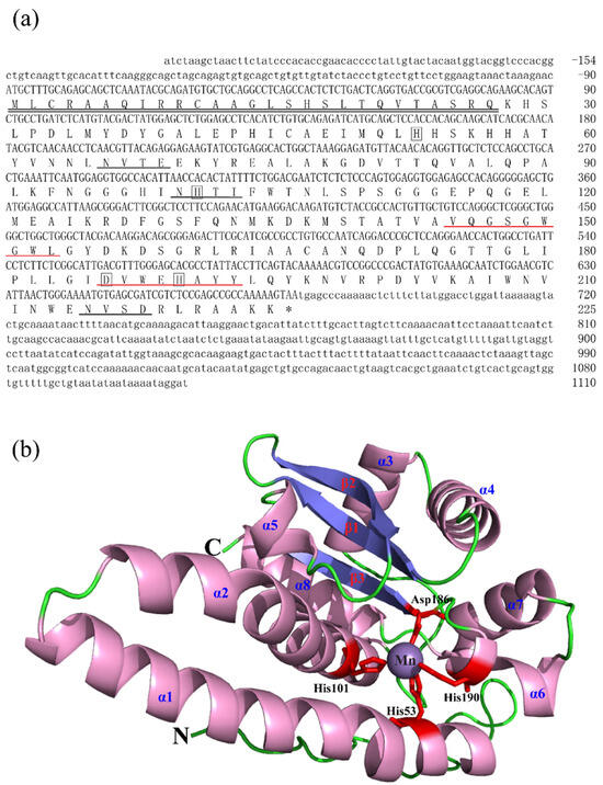 Nucleotide, the deduced aa sequences and 3D structures of BsMn-SOD. (a) Nucleotide and the deduced aa sequences of BsMn-SOD; Nucleotides are numbered from the first base at 5′ end. Stop codons are marked with asterisks; potential binding sites (His-53, -101, -190, Asp-186) in BsMn-SOD were boxed. Predicted MTS region is underlined with double underscores. Putative family signature motifs are underlined in red. Potential N-glycosylation sites are underlined in black. (b) The predicted 3D structures of BsMn-SOD.