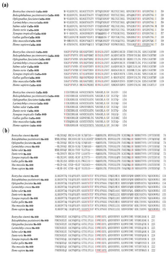 The Chinese black sleeper (Bostrychus sinensis) is an economically significant marine aquaculture fish species in the southeastern coastal regions of China. Nowadays, this species is gradually becoming an important mariculture fish in the coastal areas of Zhejiang, Fujian, Guangdong, and Guangxi provinces in China [10]. However, with the growing scale of aquaculture, the Chinese black sleeper has been adversely affected by various environmental pollutants, leading to significant economic losses. Therefore, gaining a deeper understanding of the mechanisms underlying the immune response of B. sinensis to pathogen infections will aid in the development of strategies for disease management and contribute to the healthy growth of the mariculture industry for this fish species. In this study, we identified two SODs of B. sinensis, BsCu/Zn-SOD and BsMn-SOD, and analyzed their expression profiles in the Chinese black sleeper under cadmium stress and immune challenges.