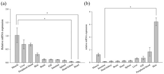 The expression analysis of ten normal tissues from the Chinese black sleeper was conducted using RT-PCR. The mRNA expression of both genes was detectable in the examined tissues (Figure 5). However, their relative levels of basal expression varied across different tissues. BsCu/Zn-SOD was predominant in muscle (1.02-fold), followed by liver (0.68-fold) and peripheral blood (0.68-fold). BsMn-SOD presented the highest expression level in the skin (6.42-fold), and the second-highest expression levels were found in the peripheral blood (1.678-fold) and muscle (1.23-fold).