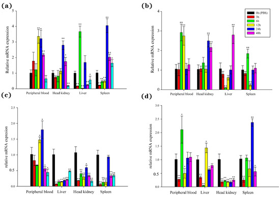 The temporal expression witnessed explicit changes of BsCu/Zn-SOD and BsMn-SOD in examined tissues from 0 to 48 h after V. parahaemolyticus challenge. The expression levels of BsCu/Zn-SOD were quickly upregulated after bacterial infection, with peak expression observed at 6 h in the liver, 12 h in the peripheral blood, and 24 h in the head kidney and spleen. The peak levels reached 3.36-fold in the peripheral blood, 2.80-fold in the head kidney, 3.67-fold in the liver, and 4.05-fold in the spleen compared to the control group (Figure 6a). However, the expression levels of BsMn-SOD were quickly downregulated (except in the peripheral blood) after bacterial infection, with peak expression observed at 24 h in the peripheral blood and at 0 h (control) in the spleen, liver, and head kidney (Figure 6c).