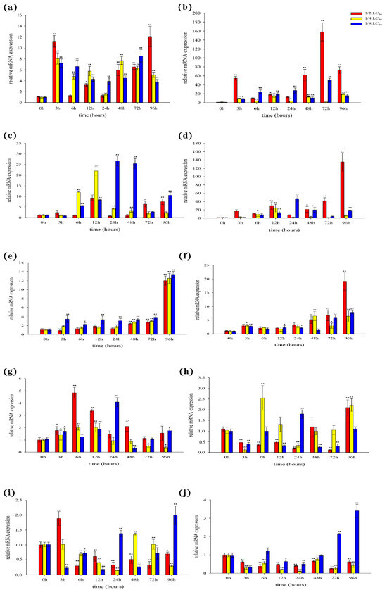 In the liver, our results showed that the expression levels of both BsCu/Zn-SOD and BsMn-SOD were quickly upregulated following Cd2+ stimulation (Figure 7a,b). However, the peak expression times of BsCu/Zn-SOD and BsMn-SOD varied at different concentrations of Cd2+ exposure. In the spleen, the expression levels of antioxidant response genes were significantly altered three hours after Cd2+ stimulation. The expressions of the BsCu/Zn-SOD in 1/2-LC50 and 1/4-LC50 peaks appeared at 12 h, while in 1/8-LC50 peaks appeared at 24 h (Figure 7c). The expression level of BsMn-SOD in 1/2-LC50 peaks appeared at 96 h, while in 1/4-LC50 and in 1/8-LC50 peaks appeared at 12 h and 24 h (Figure 7d). In the gills, expression of the BsCu/Zn-SOD and BsMn-SOD were significantly changed after stimulation by Cd2+ 72 h later (Figure 7e,f). The peak expression levels of BsCu/Zn-SOD and BsMn-SOD were observed at 96 h for all three Cd2+ concentrations. In the skin, the expressions of the BsCu/Zn-SOD in 1/2-LC50 and 1/4-LC50 peaks appeared at 6 h, while in 1/8-LC50, peaks appeared at 24 h (Figure 7g). The expression level of BsMn-SOD in 1/2-LC50 peaks appeared at 96 h, while peaks appeared in 1/4-LC50 and in 1/8-LC50 at 6 h and 24 h (Figure 7h). In the muscle, the expression profile changes of the BsCu/Zn-SOD and BsMn-SOD from Chinese black sleeper stimulation by Cd2+ were quite different. The peak from the expression of BsCu/Zn-SOD appeared at 3 h under 1/2-LC50, while in 1/4-LC50 and 1/8-LC50, peaks appeared at 48 h and 96 h (Figure 7i). However, the expressions of the BsMn-SOD in 1/2-LC50 and 1/4-LC50 are negative feedback. At the low concentration of 1/4-LC50, the peak expression of BsMn-SOD was observed at 96 h (Figure 7j).